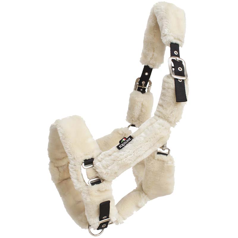 Equiline Nylonzaumzeug mit ökologischer Lammfellpolsterung (synthetisches Gewebe) Modell Terris, komplett einstellbar und bequem für Ihr Pferd. Sicherheitssystem mit Doppelschnalle, satinierten Metallringen, Karabinerhaken und Lederverschluss.
