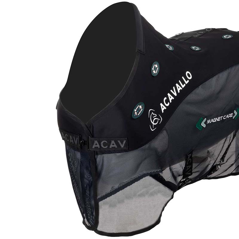 Die Acavallo Magnet Care Therapiedecke, 100 % Made in Italy, nutzt die Wirkung von Magneten für eine positive Wirkung auf die physische Erholung und Entspannung des Pferdes. Die Magnet Care Decke von Acavallo besteht aus atmungsaktivem 3D Air-Mesh-Gewebe und enthält 32 Magnete, die im Rücken-, Lenden- und Schulterbereich positioniert sind. Diese Decke verwendet die Prinzipien der Magnettherapie, um das psychische und physische Wohlbefinden des Tieres zu fördern und die Erholung nach körperlicher Aktivität zu unterstützen. Die Magnete bestehen aus einer Legierung von Neodym, Eisen und Bor, jeder mit einer Stärke von 2600 Gauss. Sie stimulieren die Blutzirkulation und haben eine gefäßverengende Wirkung, die dazu beiträgt, Schwellungen und Entzündungen zu reduzieren und allgemeine Entspannung zu fördern. Diese therapeutische Pferdedecke kann alleine oder unter einer Winterdecke verwendet werden: • während des Transports, um Reisestress zu verringern • vor Wettkämpfen, um die Blutzirkulation anzuregen und die Leistungsfähigkeit zu unterstützen • nach intensiver Aktivität, um Schwellungen und Entzündungen zu lindern