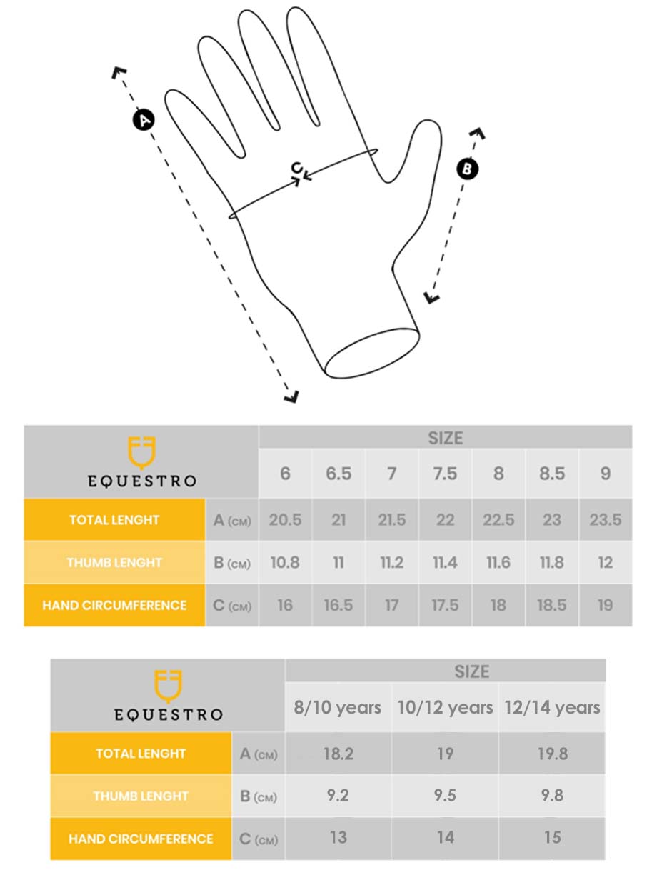 Equestro Sunny Reithandschuh mit ultra-griffigem, atmungsaktivem Material. Reithandschuhe aus ultra-atmungsaktivem technischem Gewebe für den Rücken, mit Klettverschluss und Griffeinsätzen aus Polyurethan an Handfläche und Fingern.