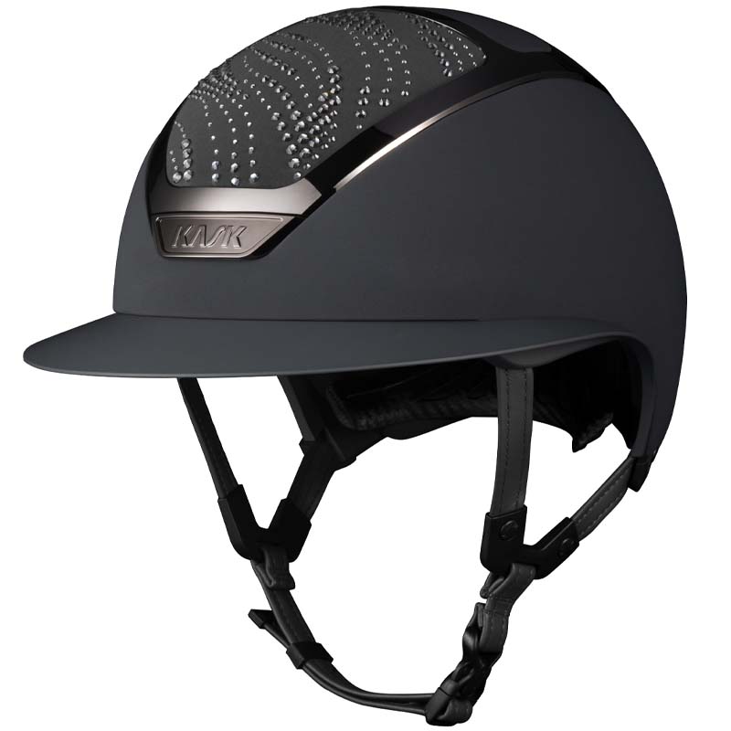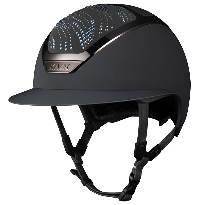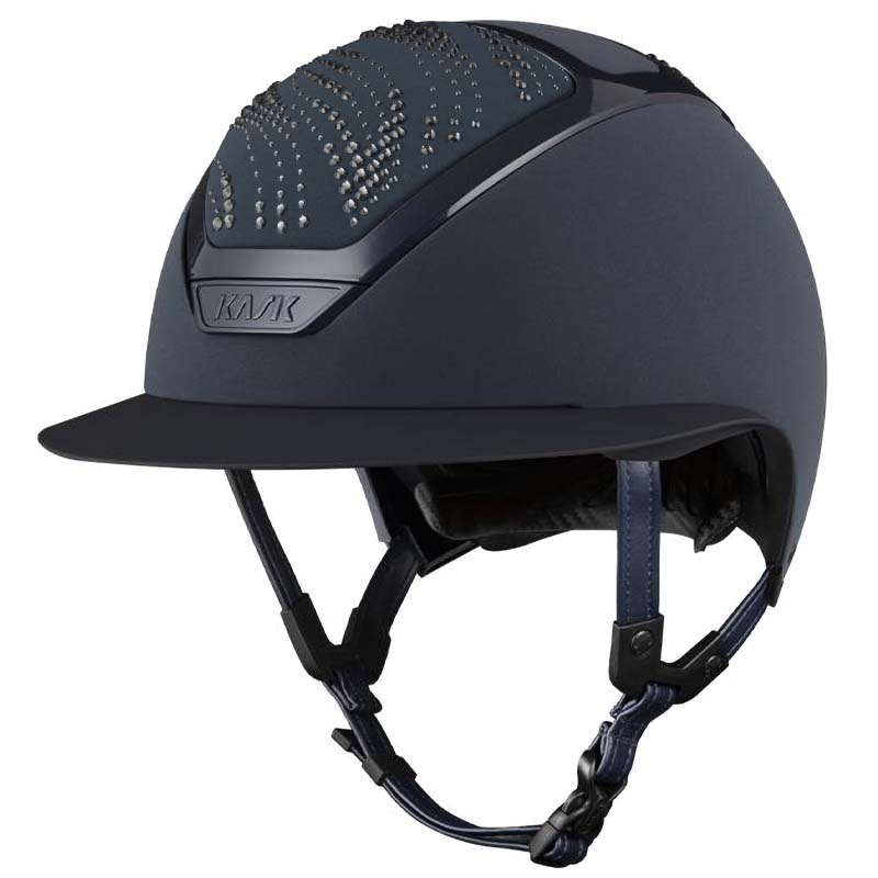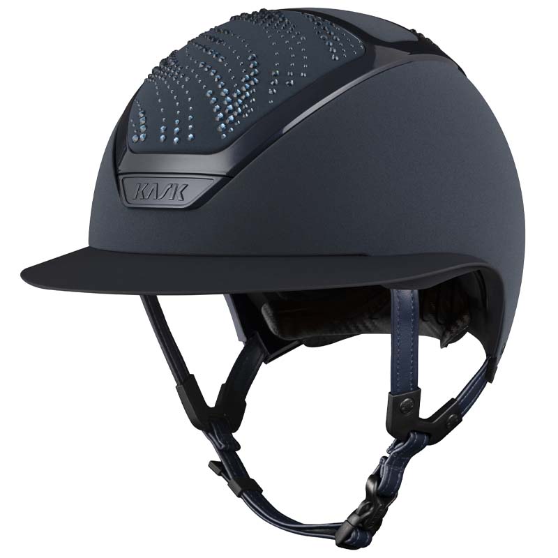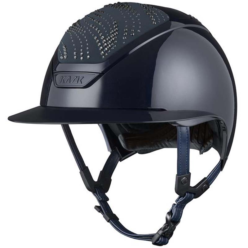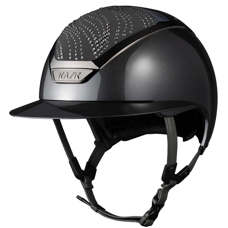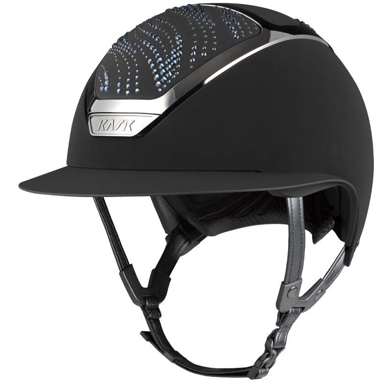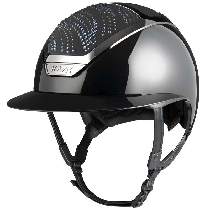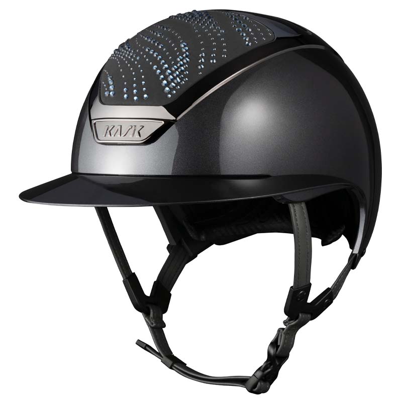 Der KASK Star Lady ANIMA Reithelm ist ein Premium-Modell mit breiter Visor, geschätzt von Reiterinnen, die Eleganz und Sicherheit suchen. Die Vorder- und Rückseite der Helmschale sind mit Stoff überzogen und mit Kristallen in der Flow-Konfiguration verziert, ein welleninspiriertes Design, das ein elegantes Lichtspiel erzeugt. Der Helm ist vollständig personalisierbar und in glänzender oder matter Ausführung sowie in 3 Swarovski-Farben erhältlich: Blue Montana, Graphite Mix und Greige Mix.